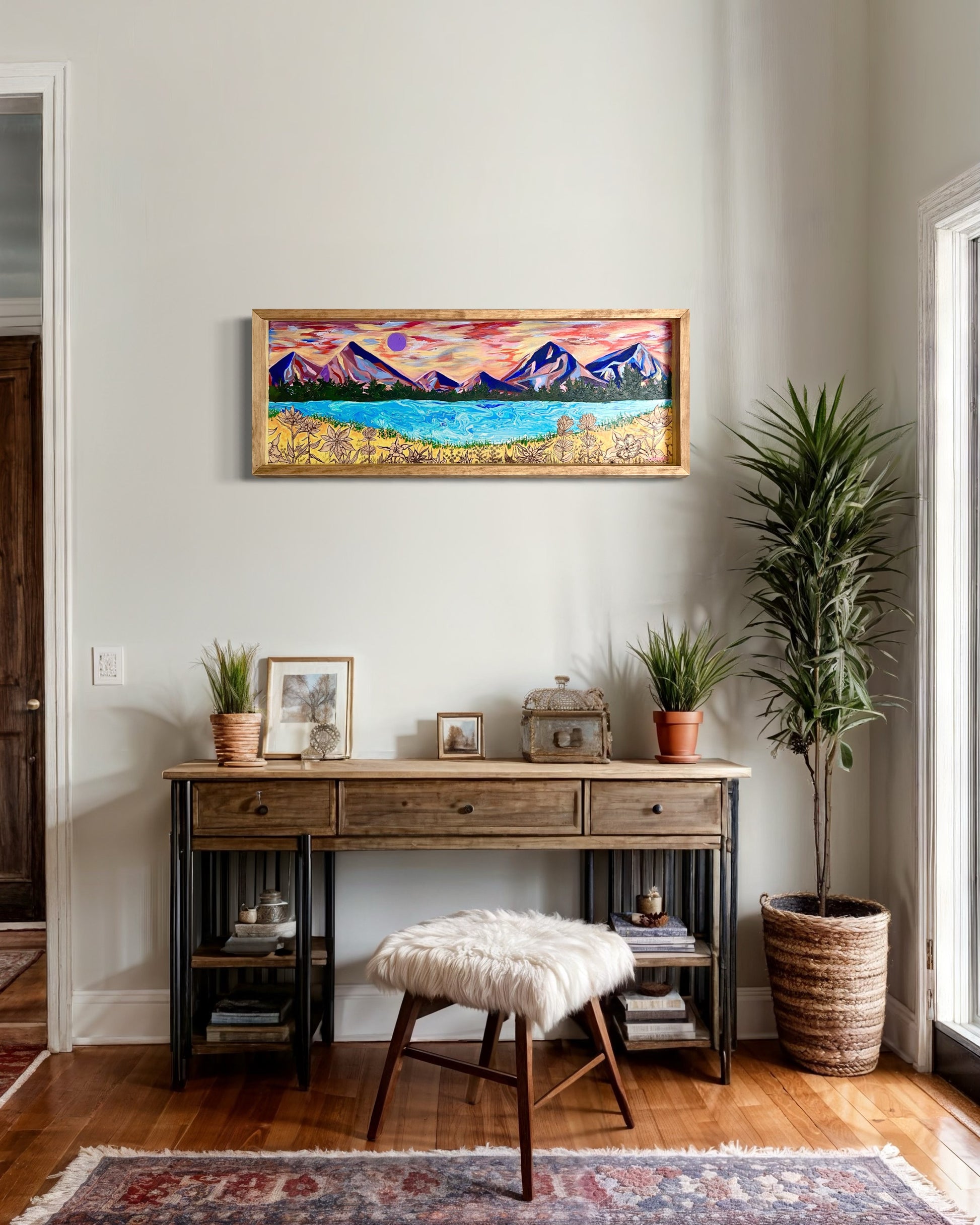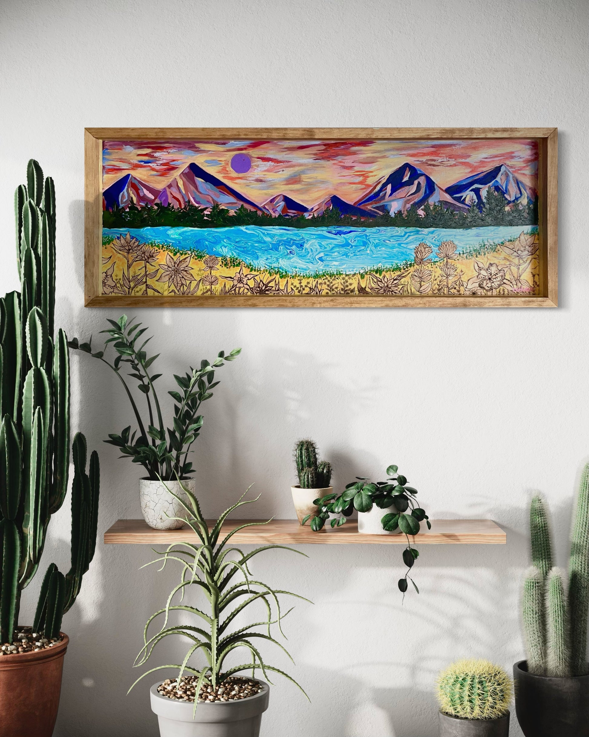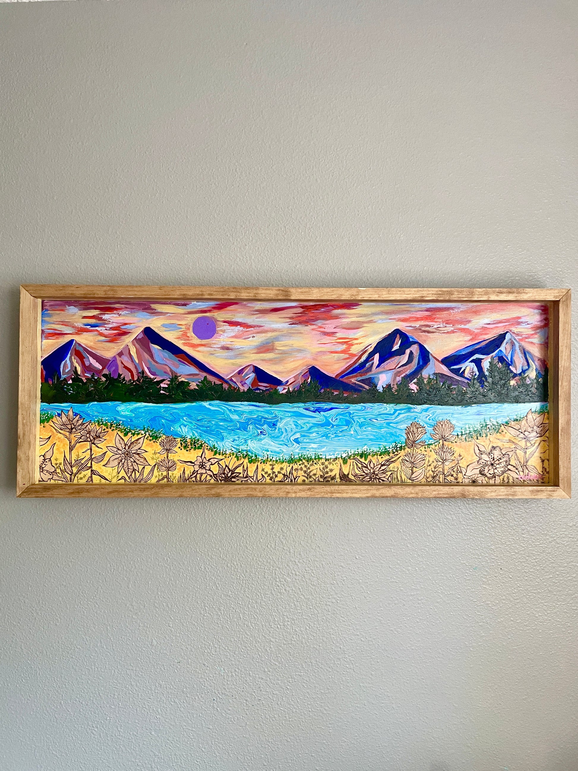 Medium: This piece is done on birch wood and wood burned to show a multidimensional feel against the water-color and acrylic paints. The lake is of an acrylic pour or marbled art technique to represent the flow and constant change of water.