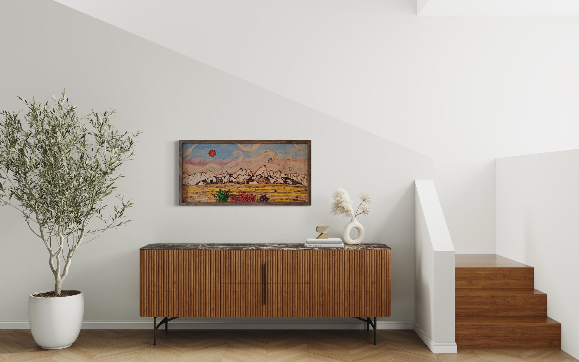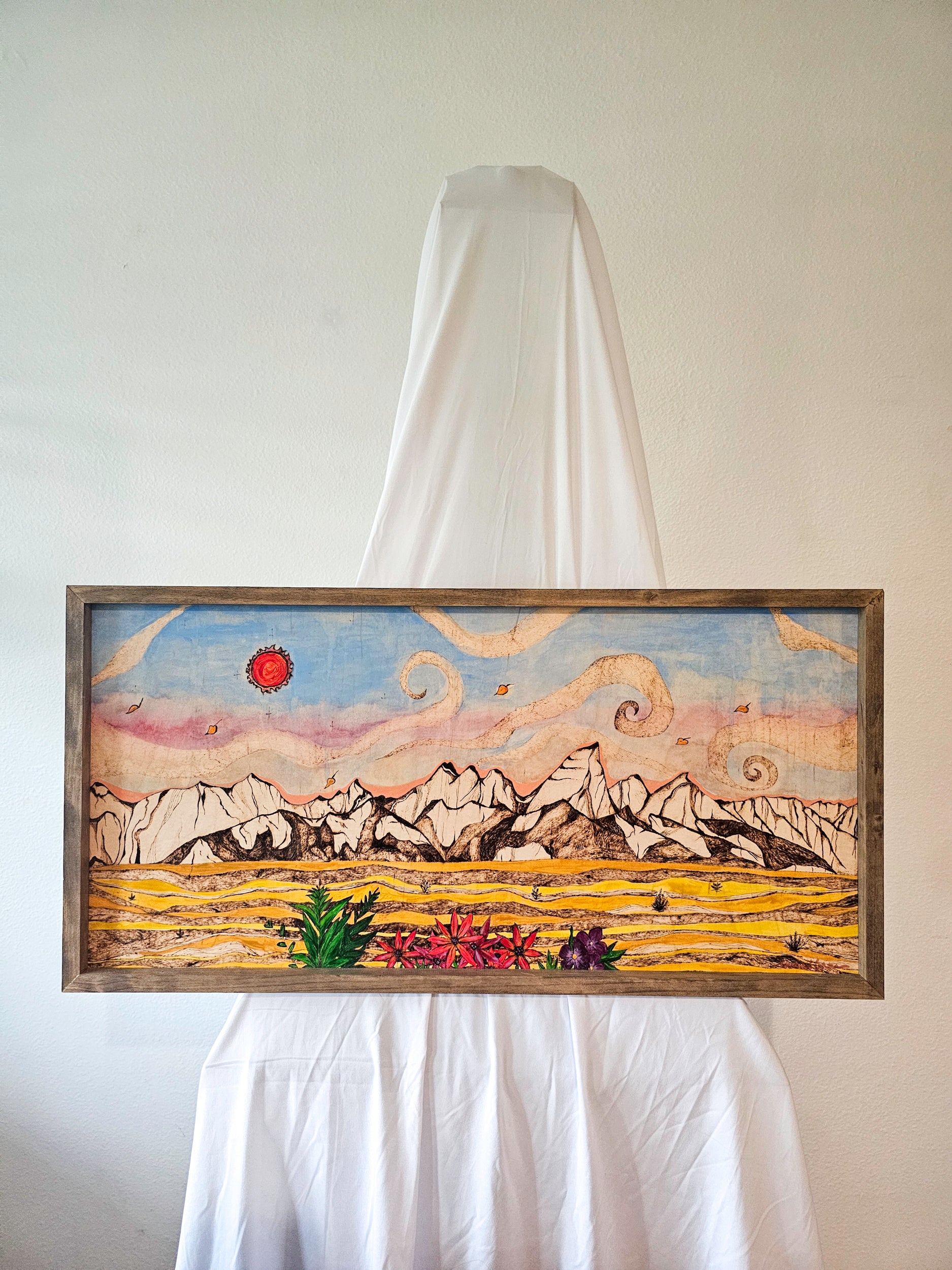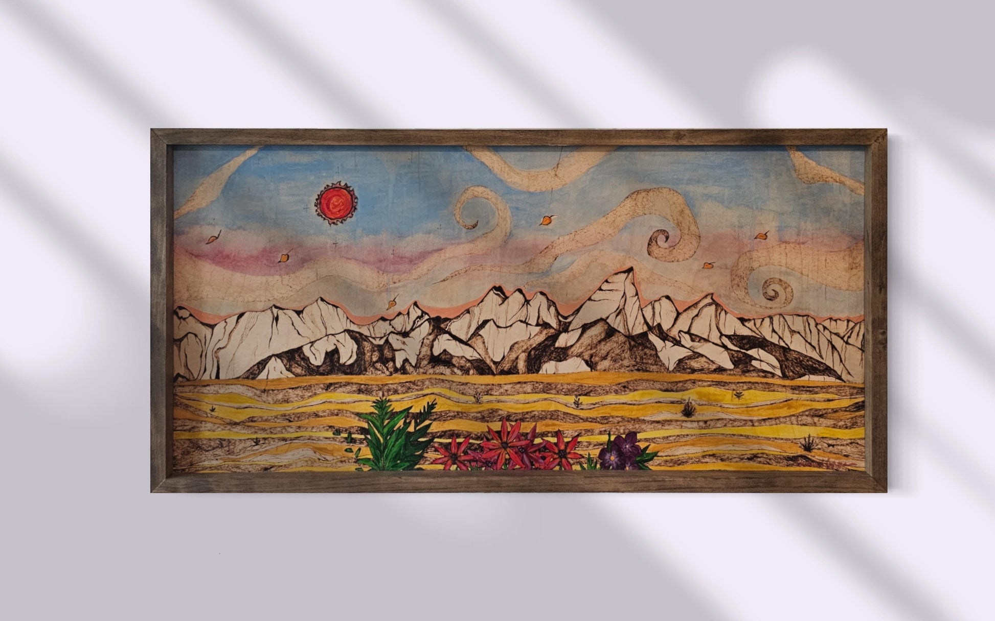 The Story behind the Piece: This piece was inspired the fall season in the mountains. I used the Grand Tetons in this piece to highlight the changing leaves that come from the meadow below. A vast valley that stays golden all year round, accompanied by changing flora all around. I also used water color to bring a feeling of fresh after rain. The lines from the Wood Burn create emphasis on the detailing of rugged lines. Original wood burned art set to make a difference in a home space or office. Pairs so well with other art pieces and furniture.