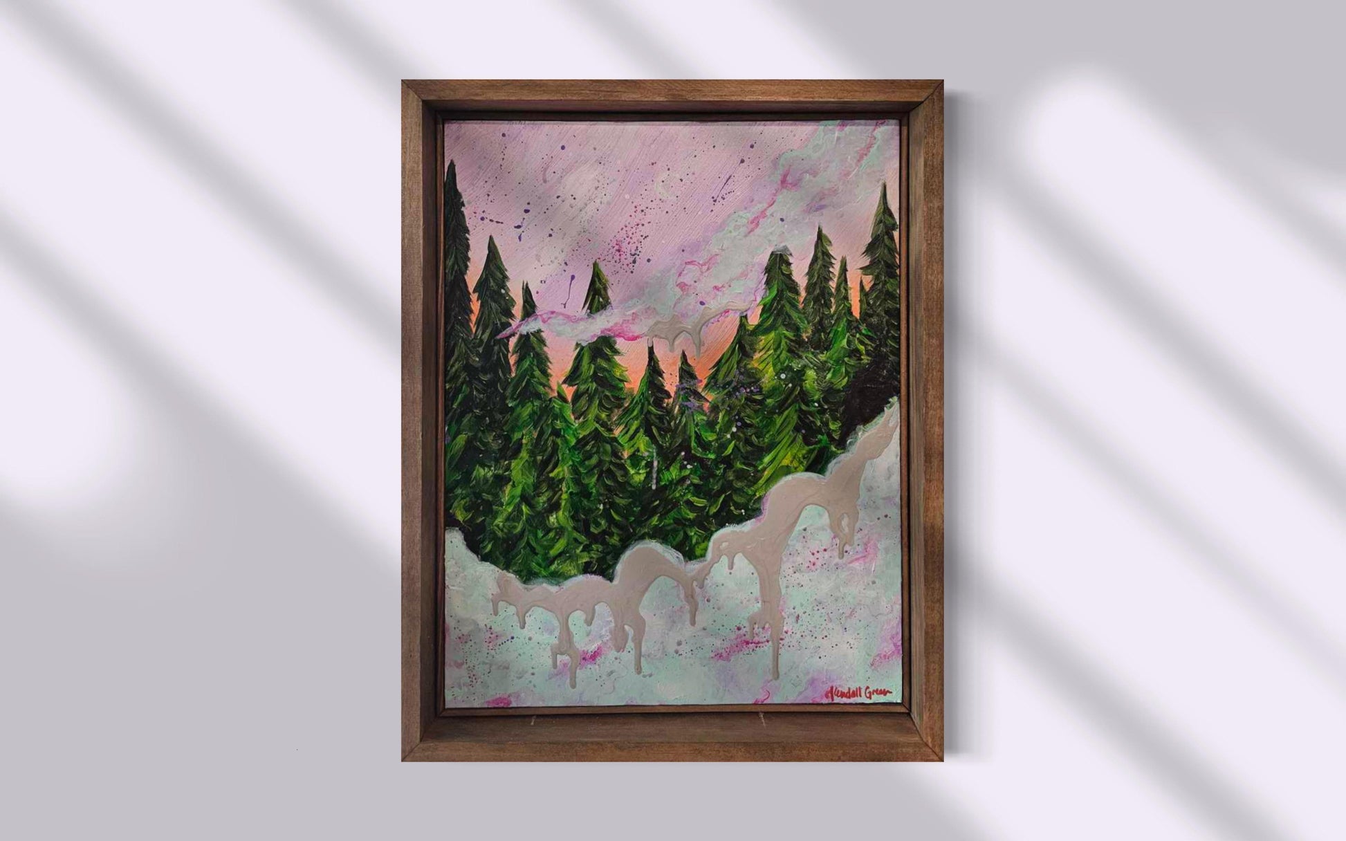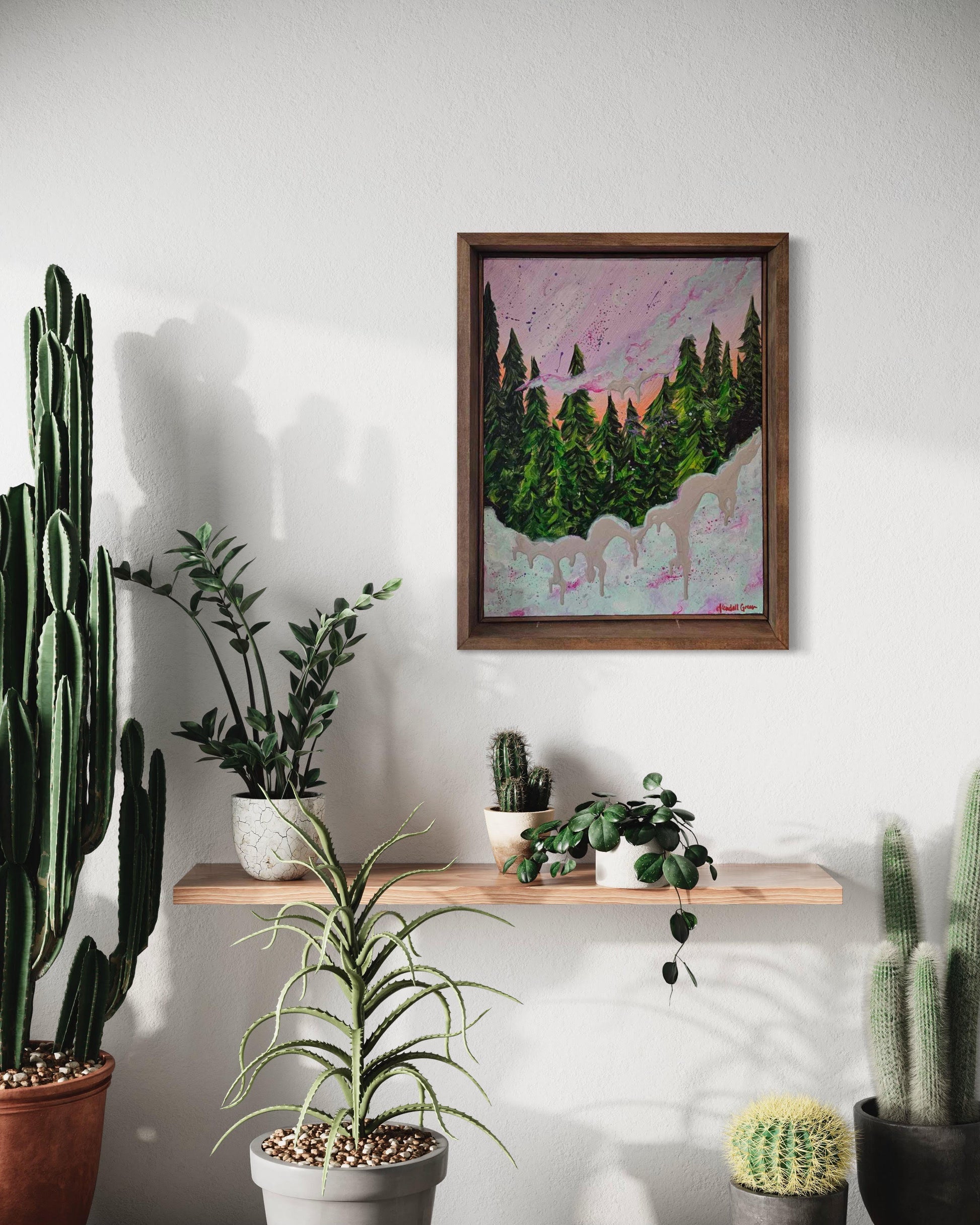 The Story behind the Piece: Forests in the dreary weather is the best. I love how much the greens stand out against the grey. Fog reminds us of the mystical, covering the unseeable. I love that trees have their own networking community that we don't get to see and I was inspired to bring life to foggy days. Leaving the forest world up to the imagination. Vibrant colors used on canvas to emphasize sharp lines and bring fun color to a home space or office. Pairs so well with other art pieces and furniture. Pouring paint medium used to emphasize fluidity. Be it water or skies, it is never still, always going forward- a concept that the pour captures.