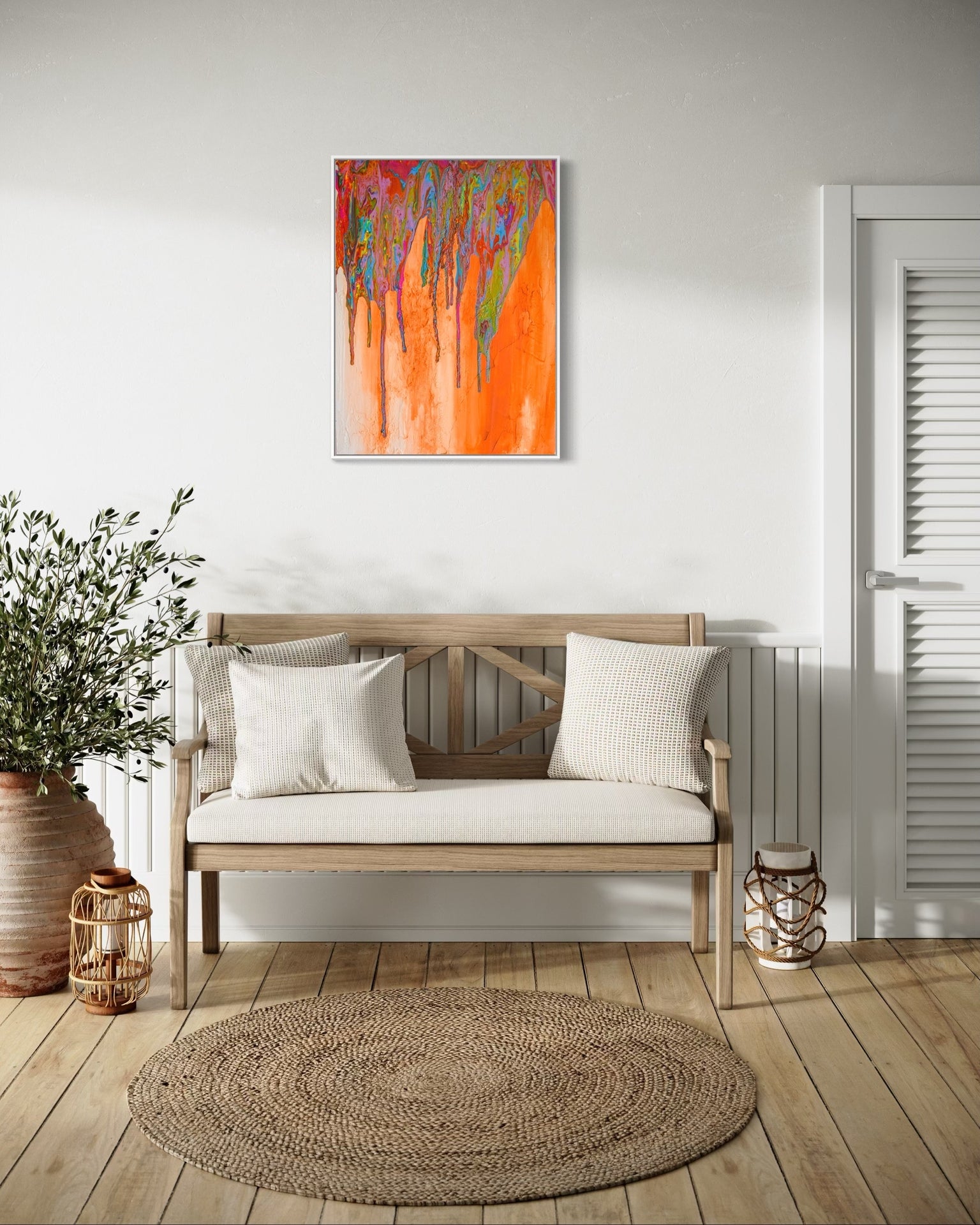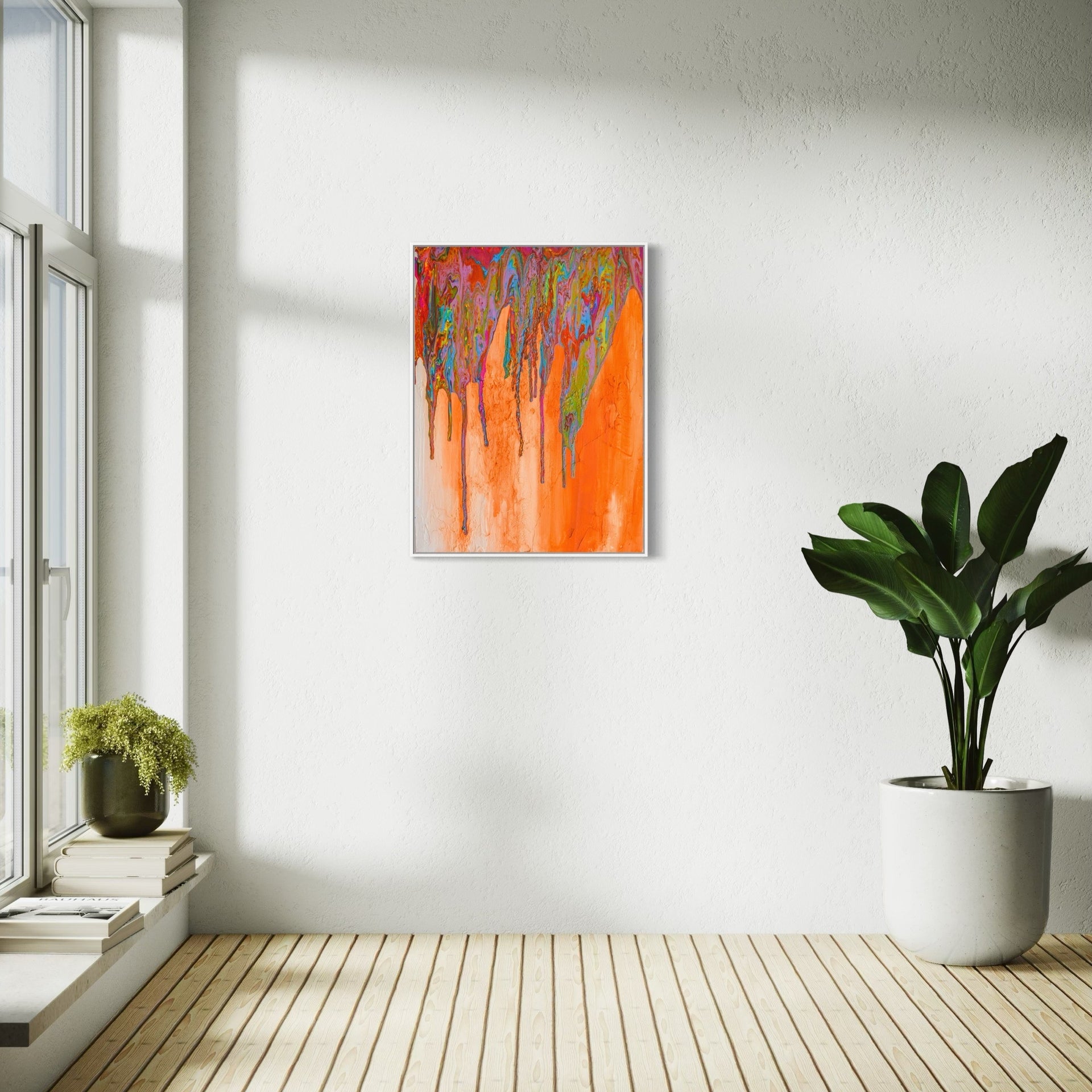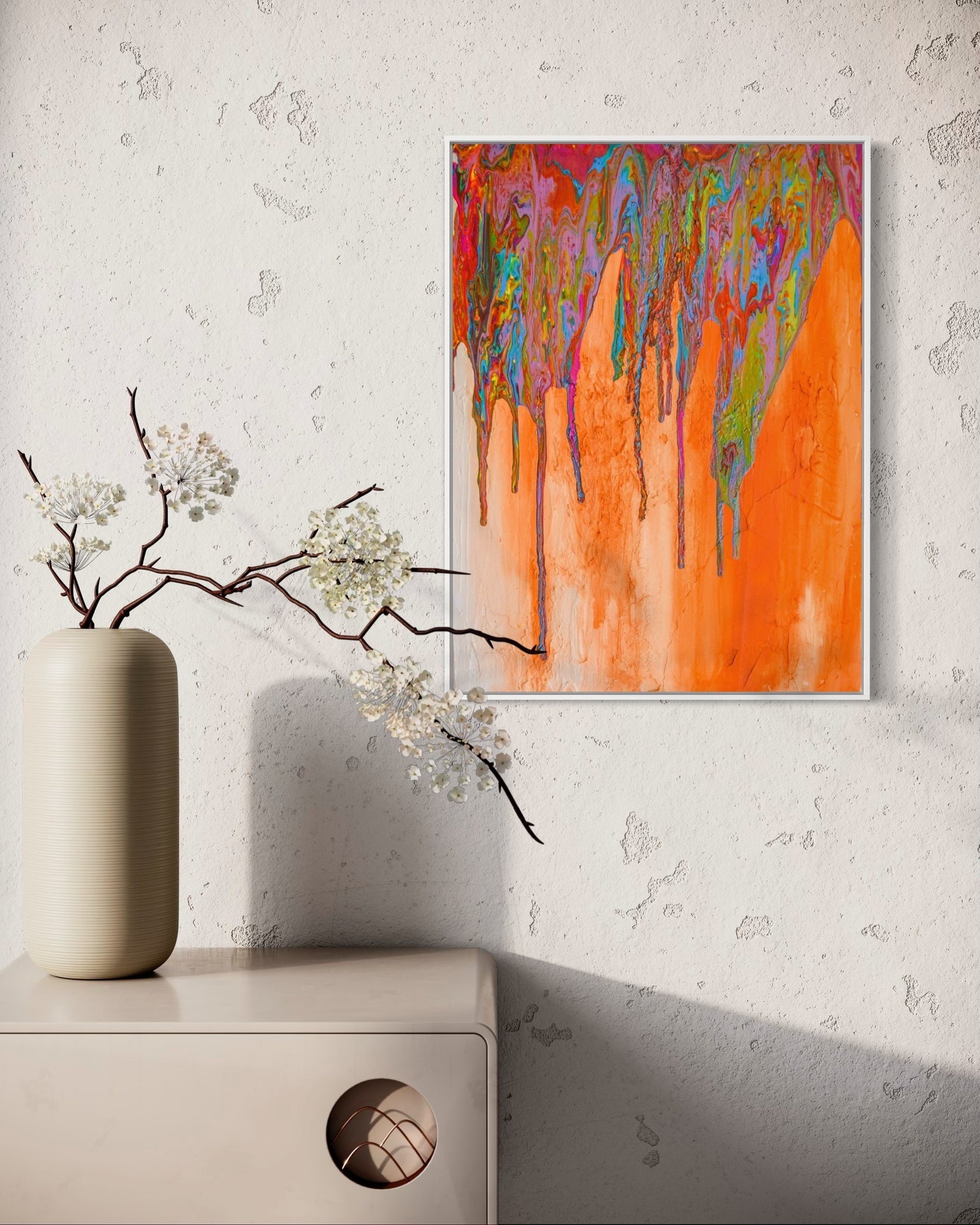 High-Quality, Museum grade fine art print of "Good Morning". A brightly colorful pour depicting sunshine cascading down rock walls in the early mornings. Illuminating the possibilities of the day ahead.