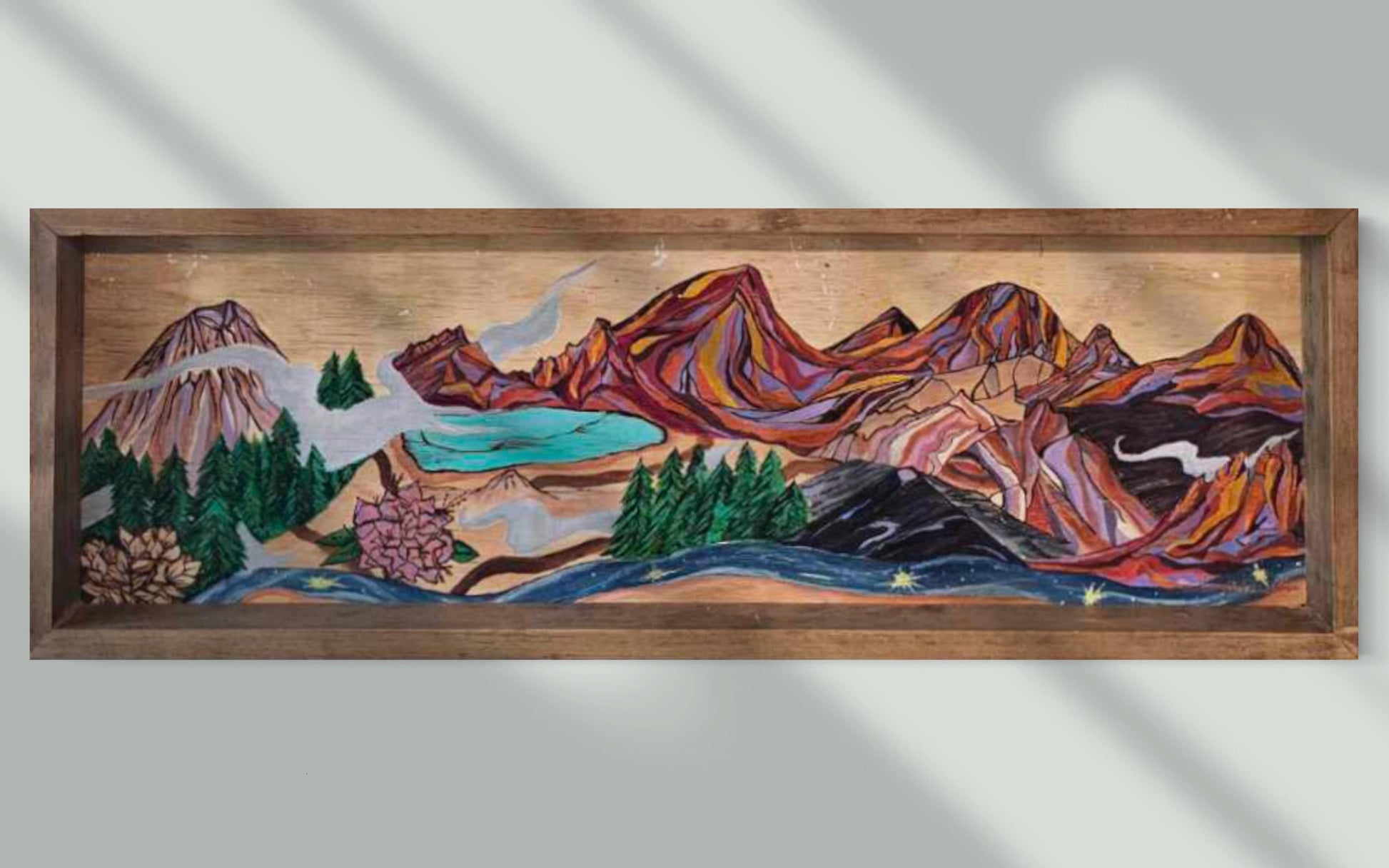 Mediums used: Wood burned drawing and shading and acrylic painting to create a multi-dimensional effect when looking at the piece head on. I also used Watercolor to create a faded look so that I did not overshadow the wood grain.