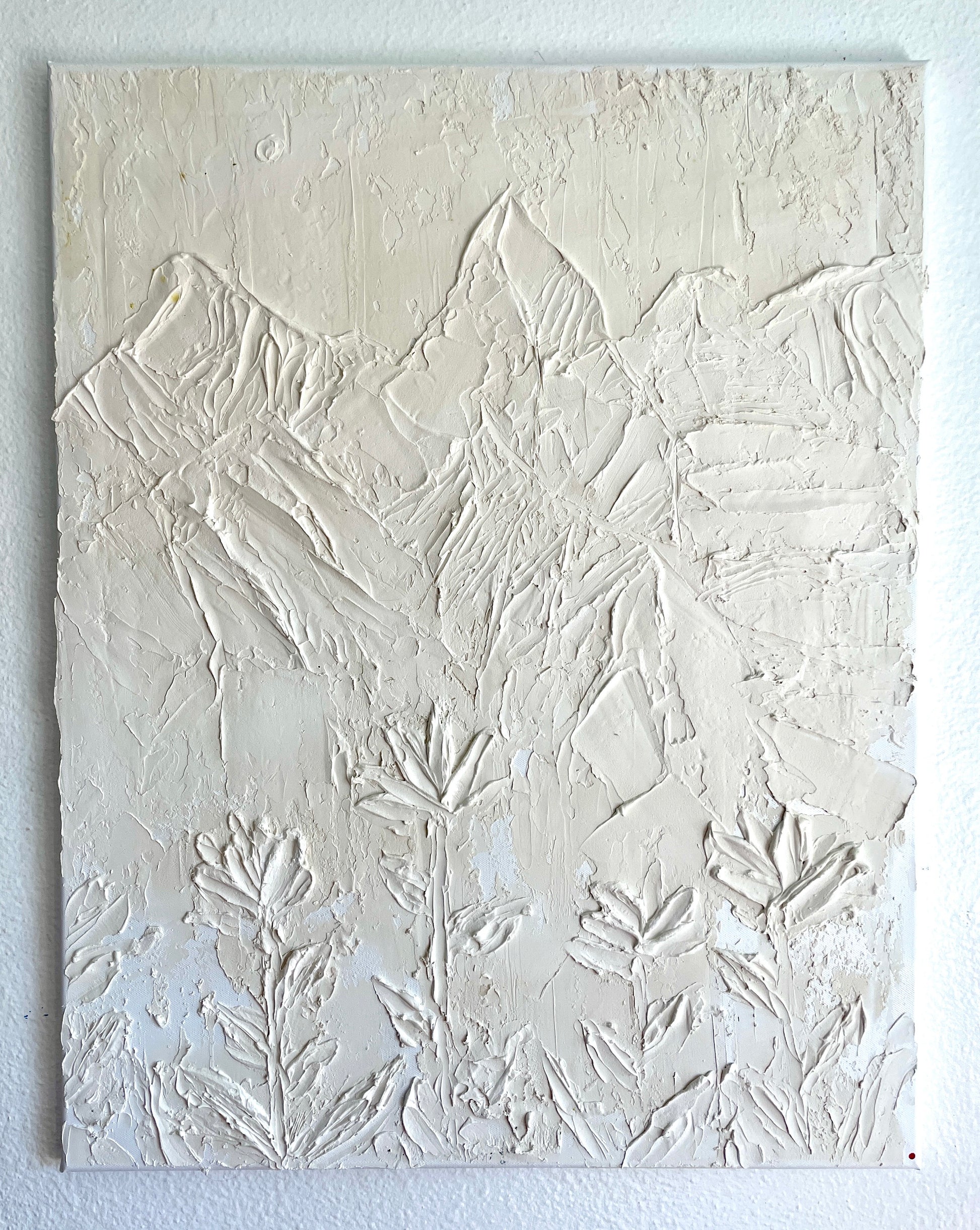 The Story behind the piece: Inspired by natural landscape textures of mountains, locked in time represents a fleeting memory of a place we've visited. Seemingly unchanged yet constantly moving. Mountainscape and wildflowers of Spring season locked in forever.