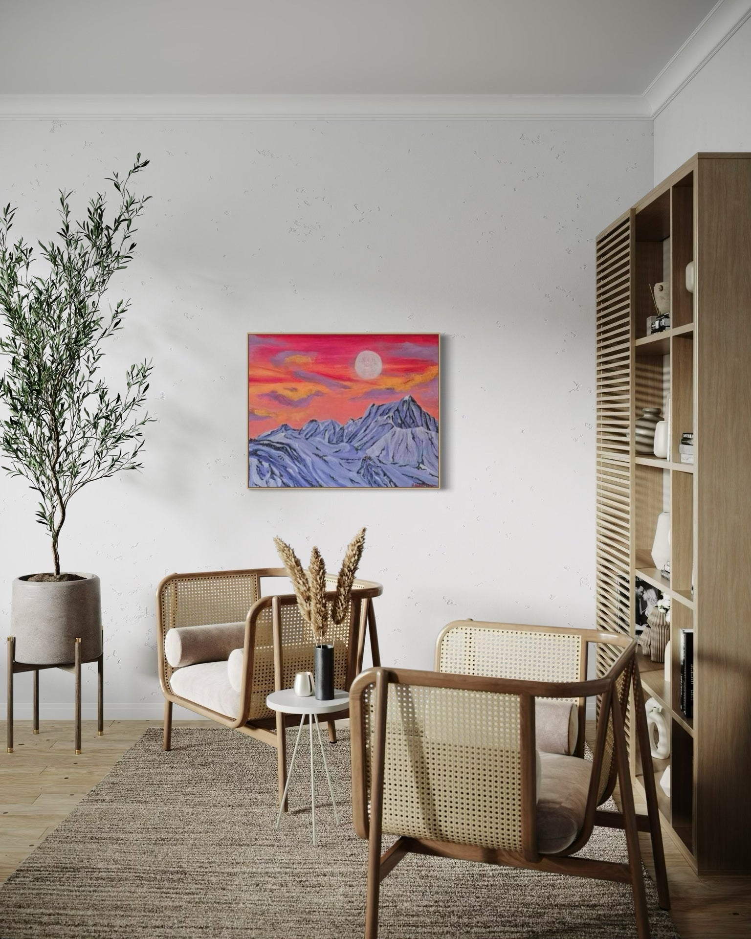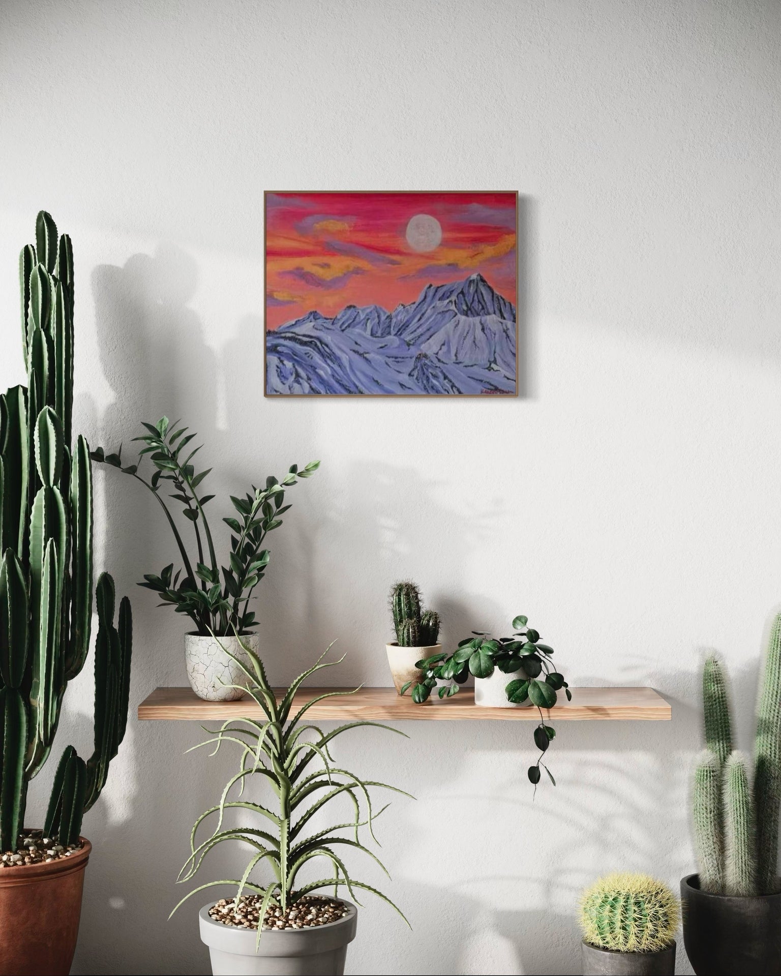High-Quality, Museum grade fine art print of "Moon Glow". Another appreciation mountainscape painting of the Sierras Mountain Range that run along Northern California. Pink skies that paint the sky during high Summer. Snow on ridges to promise another crisp winter ahead.