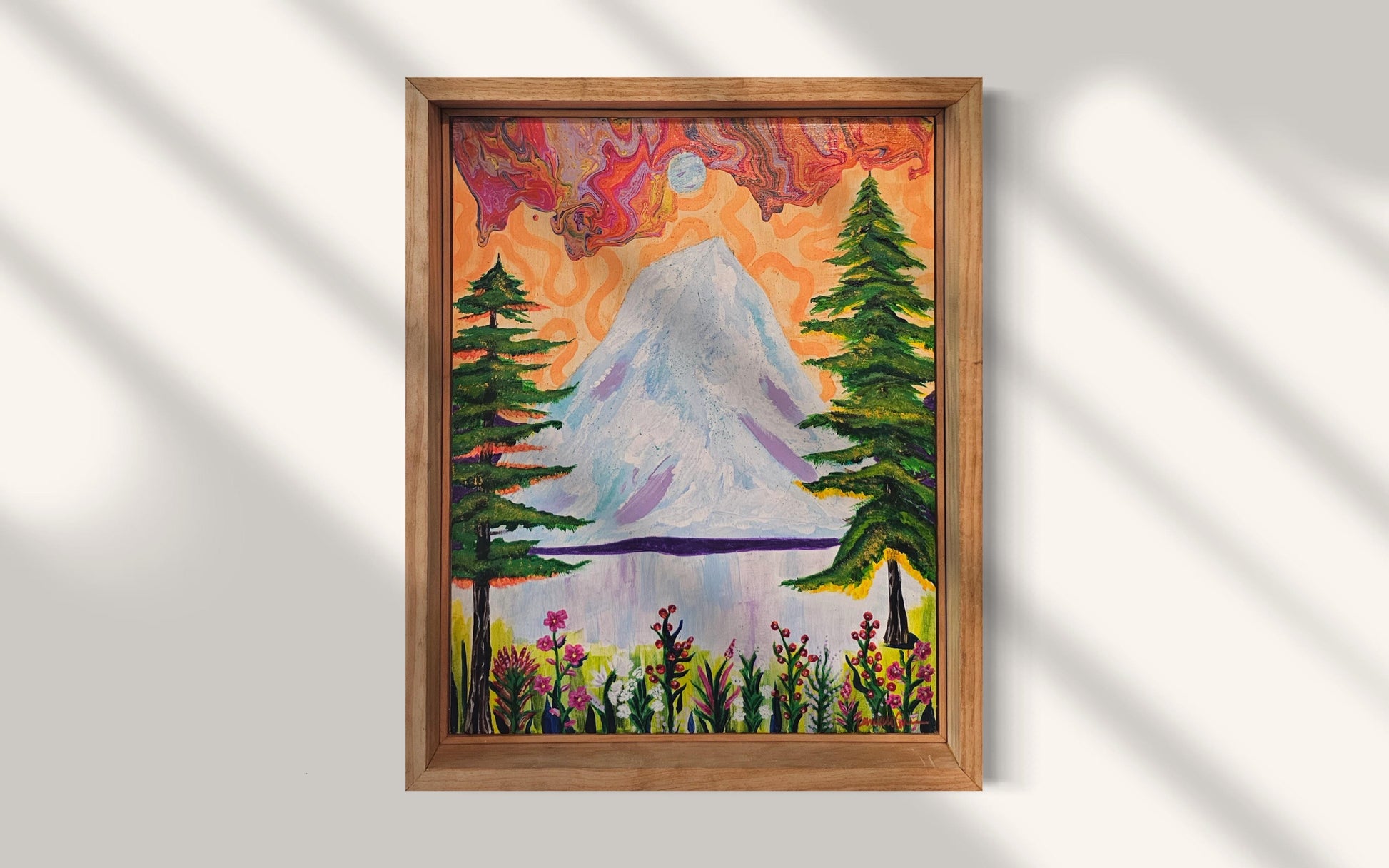 Medium used: Acrylic on Canvas and I used Acrylic with a pouring medium to create the fluidity that you can see in the skies. I added various layering to contrast colors on this piece. I also use Iridescent colors that may flicker in certain lights. It's very subtle though :)