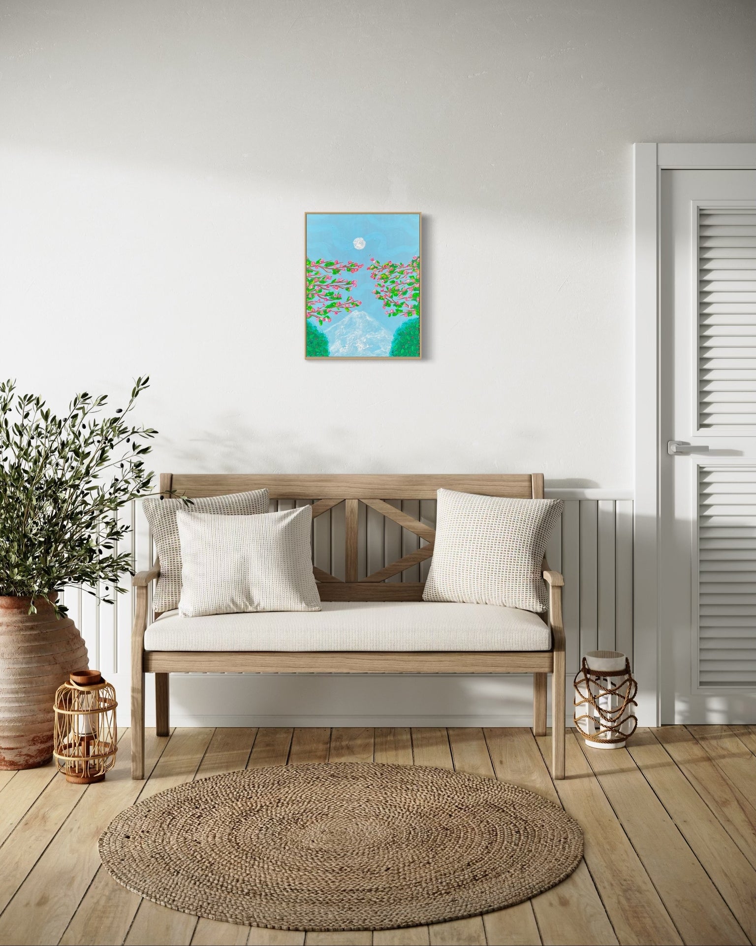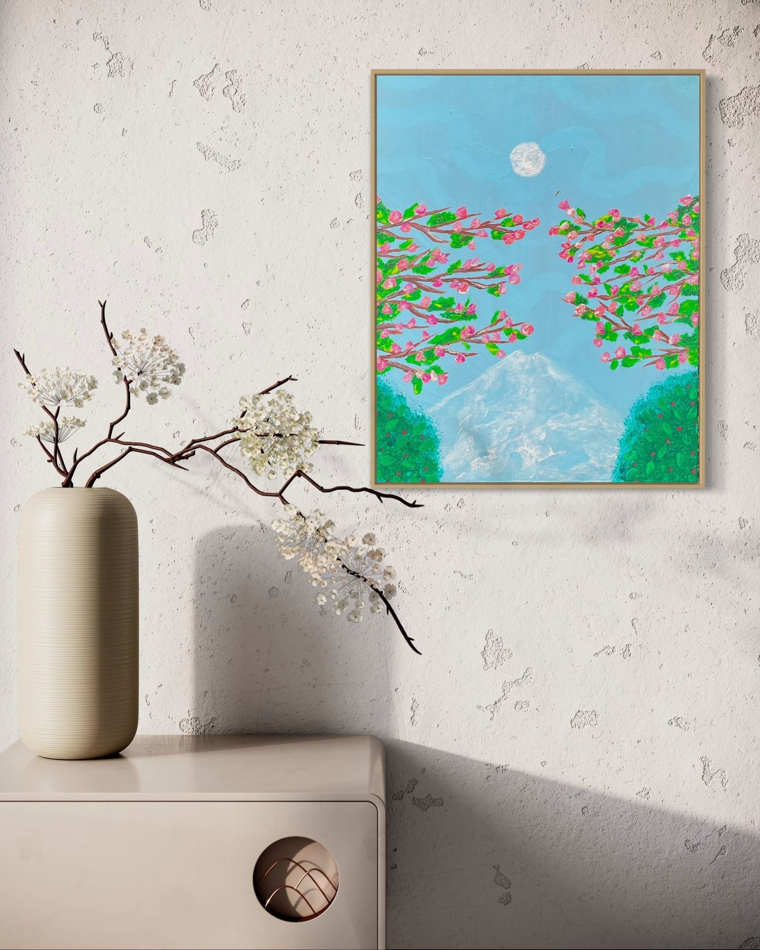 High-Quality, Museum grade fine art print of "Mt. Hood". Little full moon peeking through the trees, sitting above Mt. Hood, a volcanic mountain in the PNW, Oregon. Colorful flowers and bushes to indicate spring time, a season of refresh and possibilities.