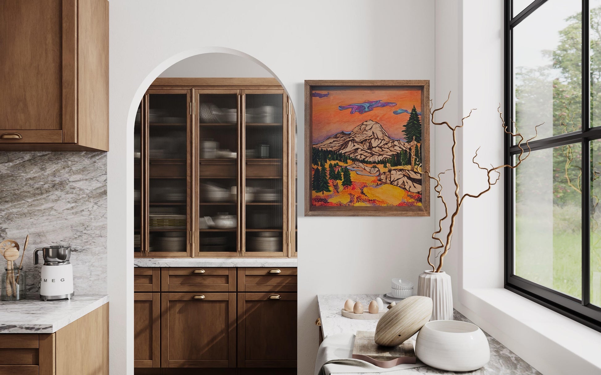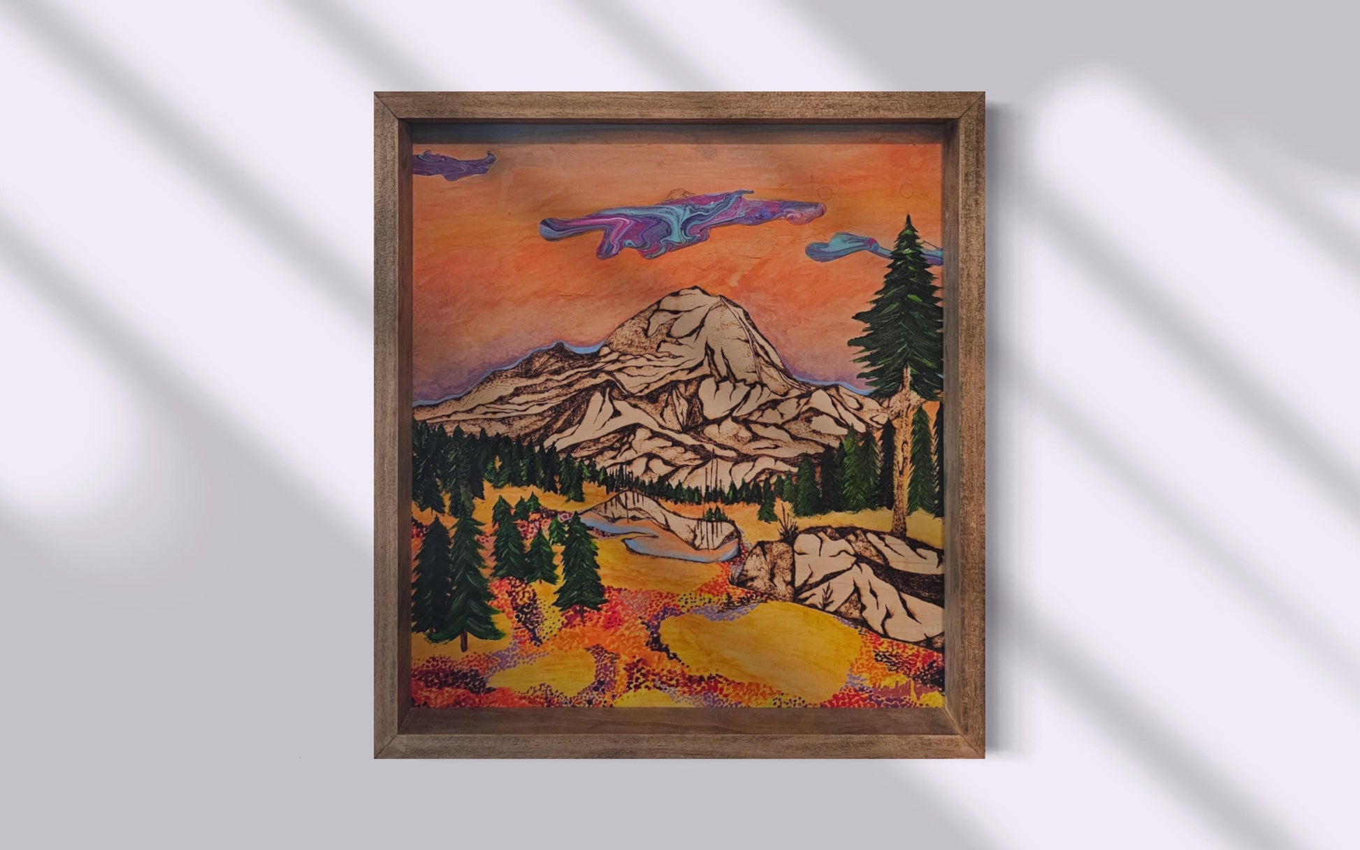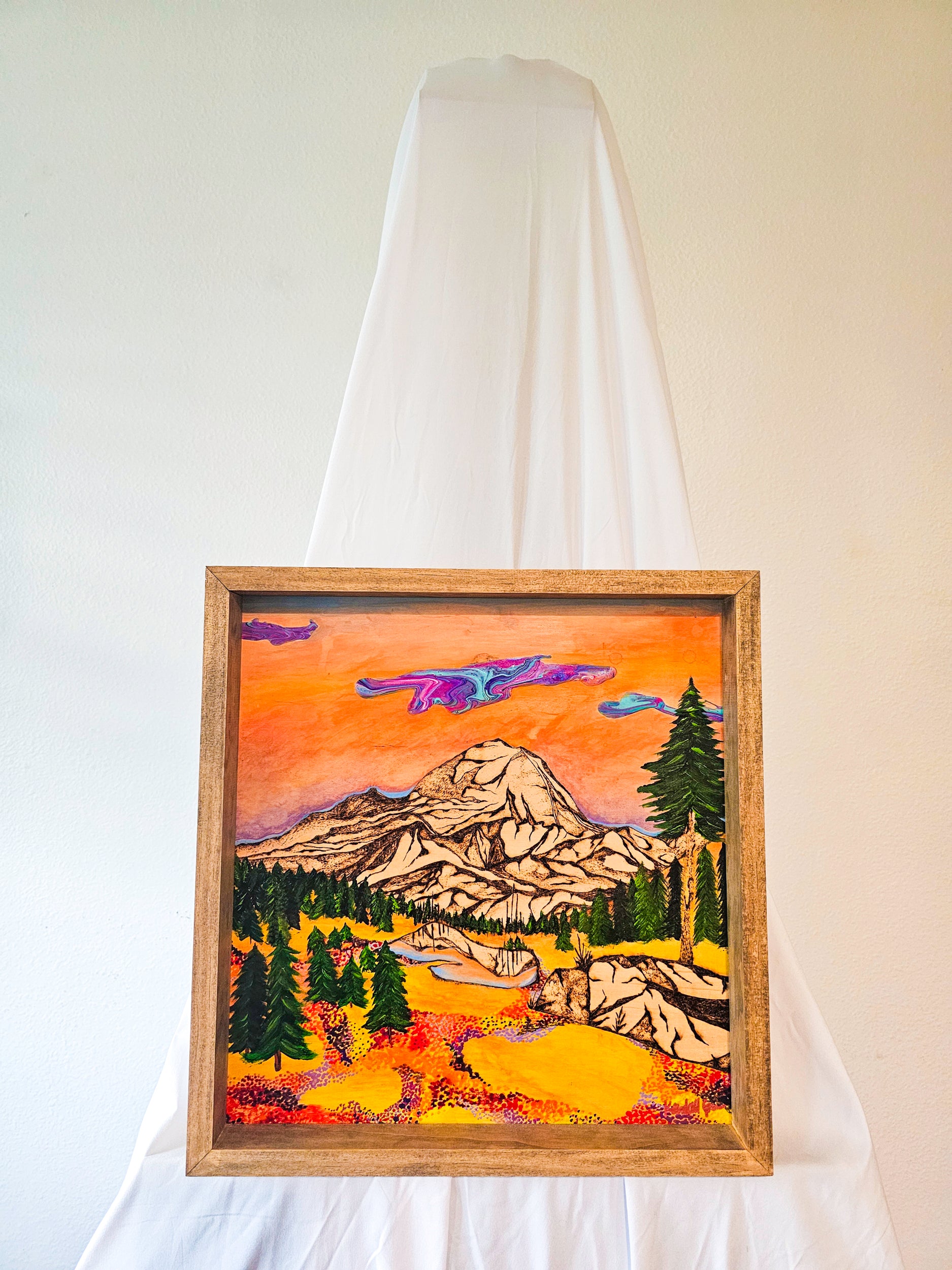 The Story behind the Piece: This Piece was inspired by Alpine wildflowers. The strength and impressive fight to survive in such harsh conditions is inspiring to me beyond the beauty. Wildflowers add so much wonder to the landscape and the color of them are so vibrant I wanted to capture a field of them in front of Mt Rainier. To stop in a meadow and marvel. The lines from the Wood Burn create emphasis on the detailing of rugged lines. Original wood burned art set to make a difference in a home space or office. Pairs so well with other art pieces and furniture.
