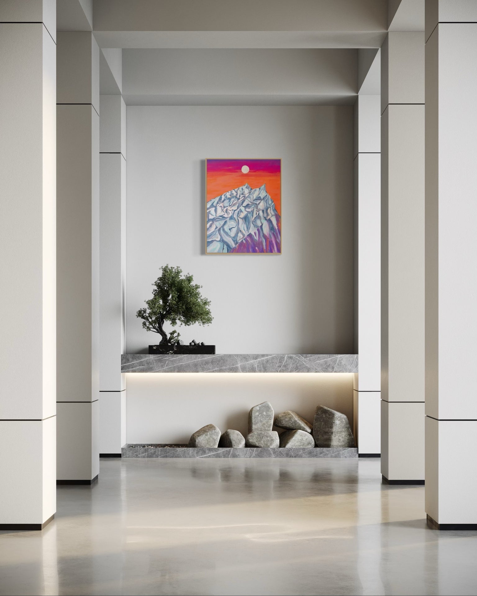 High-Quality, Museum grade fine art print of "Summit Sunset". Warm, familiar colors illuminating the Summit of a mountain peak inspired by the Grand Tetons.