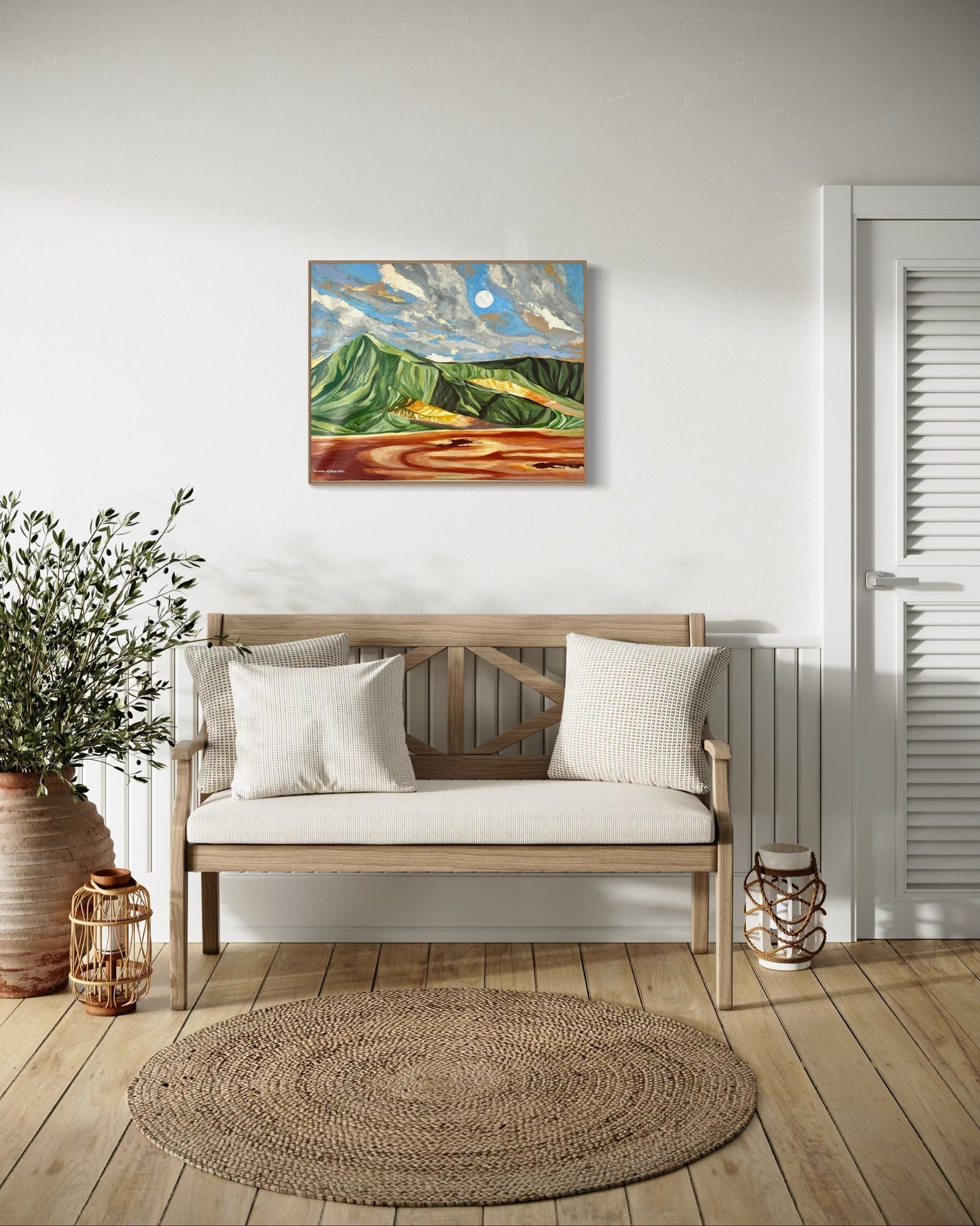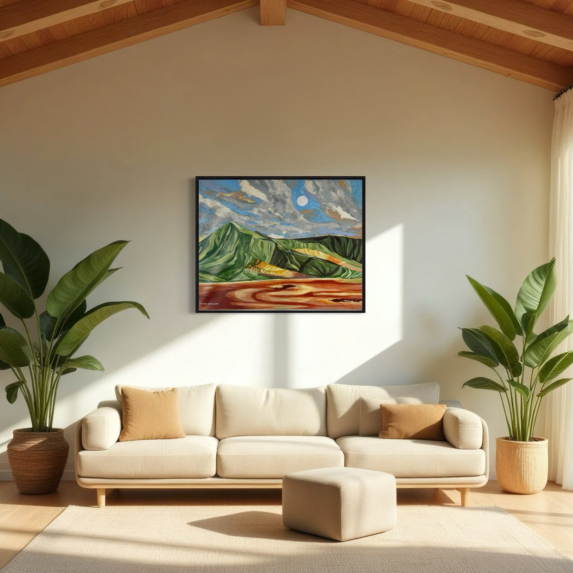 High-Quality, Museum grade fine art print of "Timeless". Inspired by a landscape painting done in 1960, this print shows a testament to times trekking onward, while landscape remain constant, unchanging, through the generations. Calming rolling hills among a stretch of wildness, where travelers and tourist have trekked on through time.